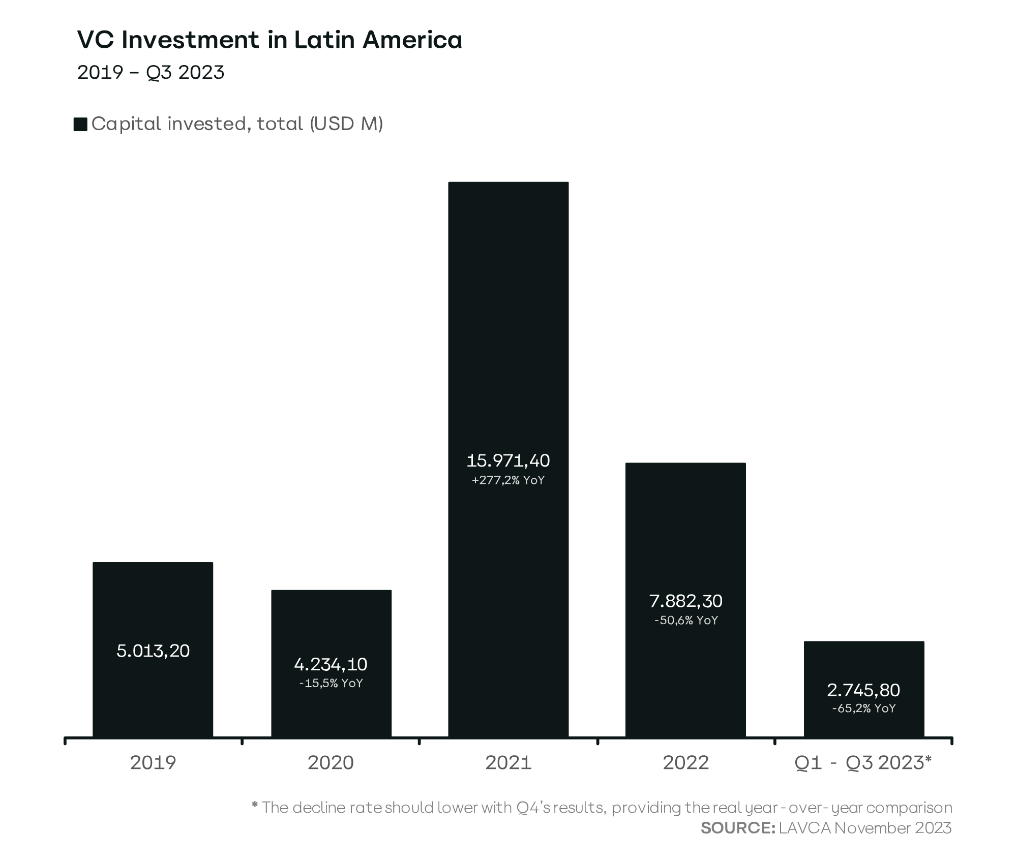 LatAm's grandness comes in many other forms, though. It also shines through when its startup founders transform challenges that seem as insurmountable as Aconcagua into opportunities as vast as the Amazon river. And as persistence is key, they do it time and time again – even when the outlook seems bleak. We end this year with an estimate that our fundraising levels will go below pre-pandemic levels.