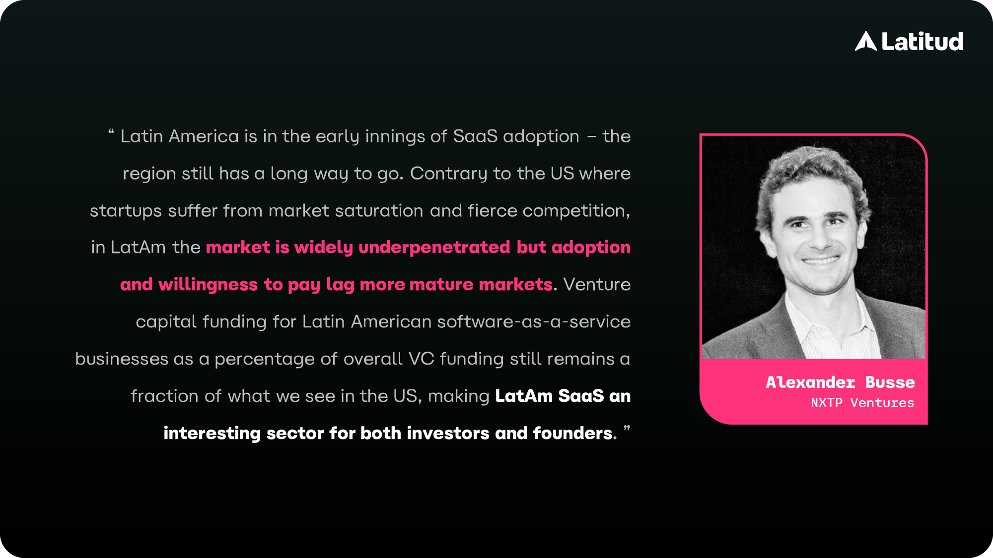 LAVCA – LatAm's SaaS venture capital funding (selected software verticals: ERPs, CRMs, and Other Enterprise Software): 2021) USD 479.3M 2022) USD 150.9M 2023 YTD (Q1-Q3) USD 200.8M