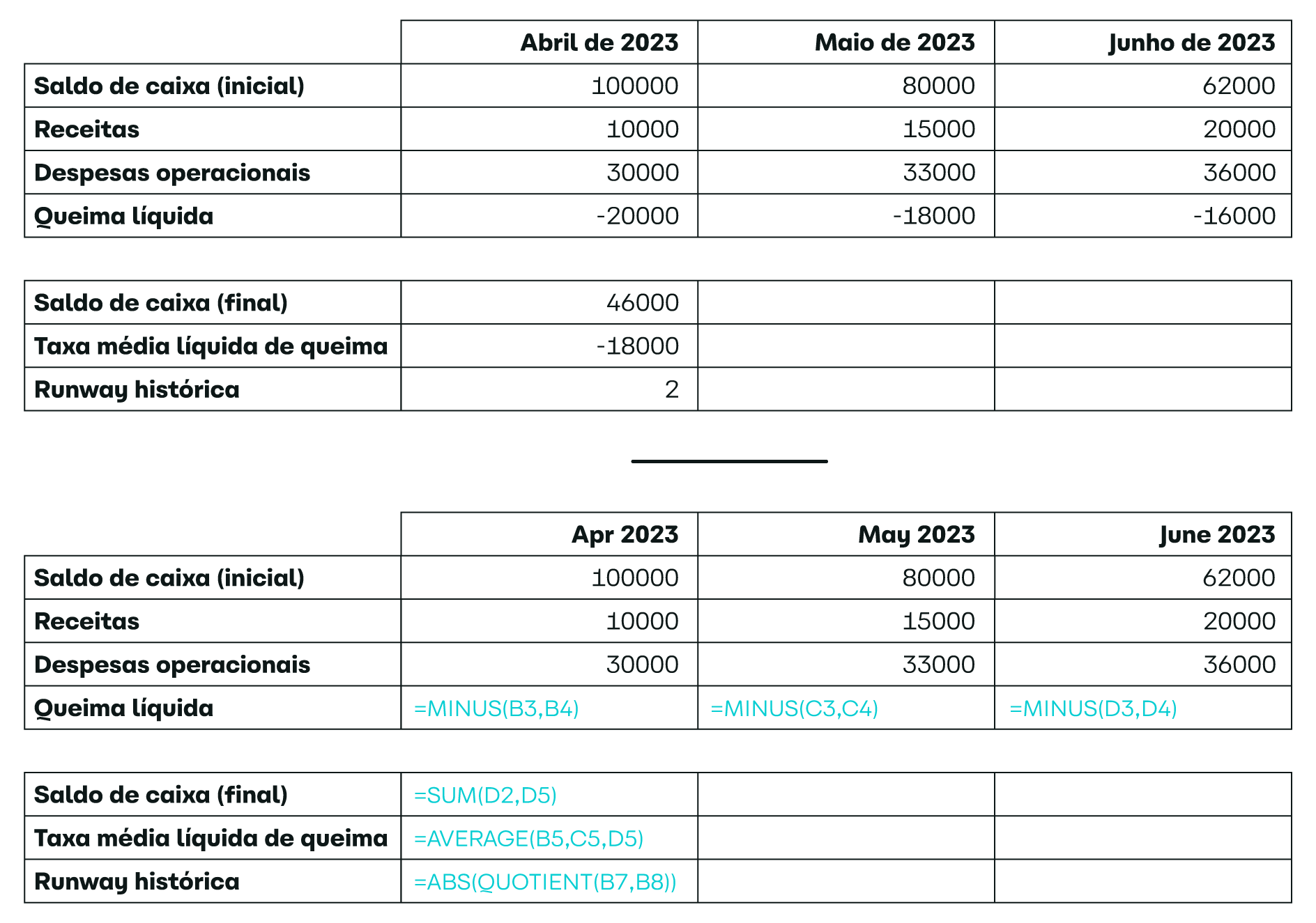 No Google Sheets ou no Excel, você pode calcular a queima líquida média através da função AVERAGE, levando em consideração o período que desejar. Em seguida, pegue o saldo de caixa atual e divida-o por essa queima líquida média.