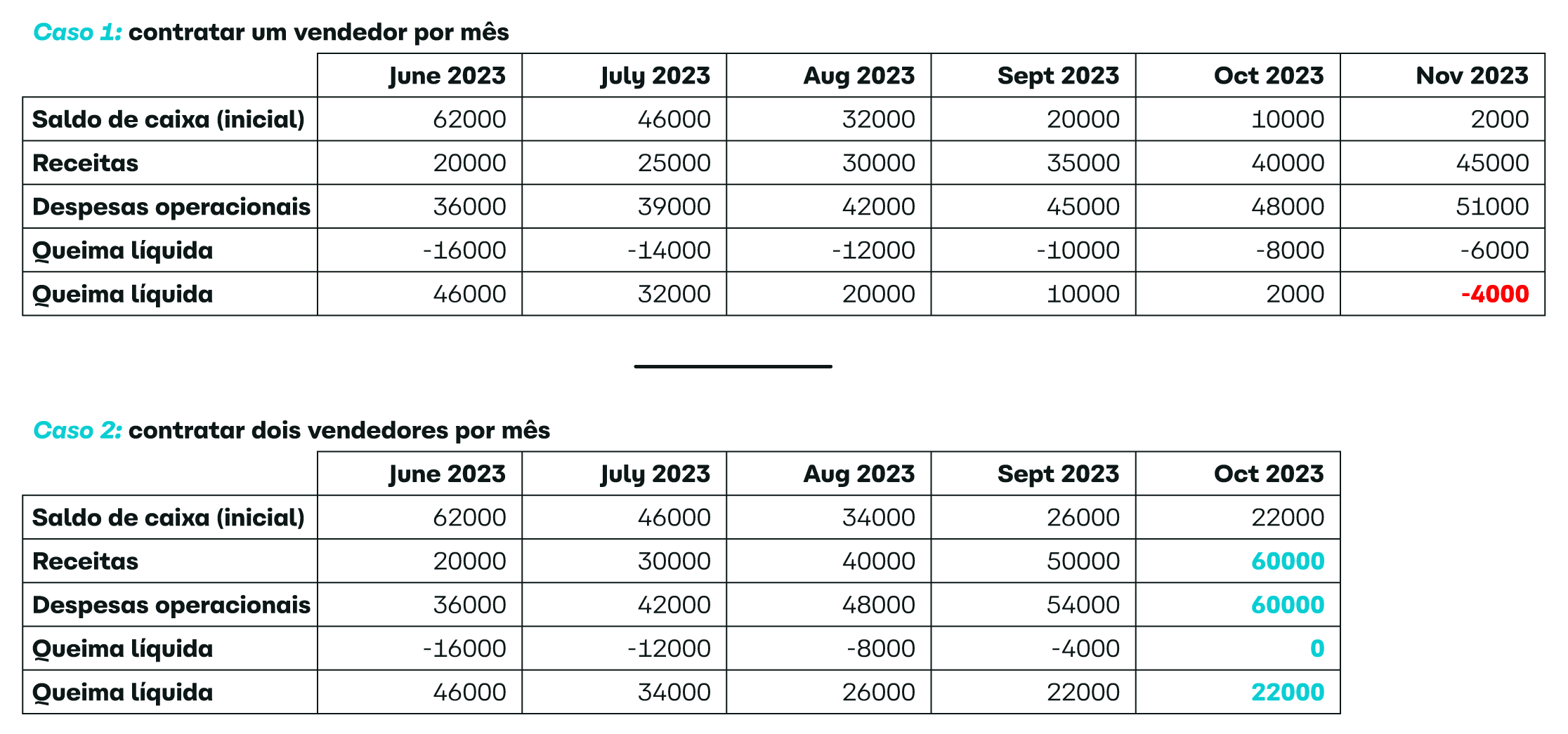 Me dá um exemplo de cálculo da cash runway projetada? No final de junho, você percebeu o que havia acertado. E está bem confiante de que pode contratar pessoas pelo mesmo salário e que elas venderão tanto quanto os funcionários anteriores.
